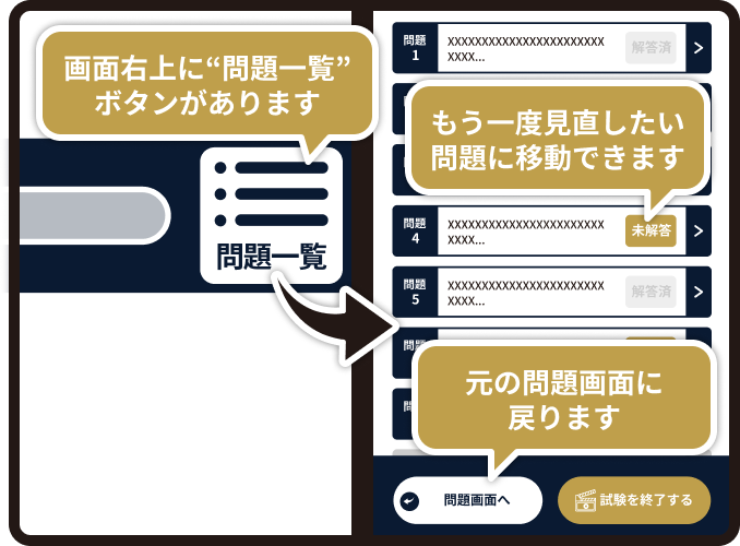 「問題一覧」ボタンから表示済みの問題を再確認して高得点を目指しましょう!